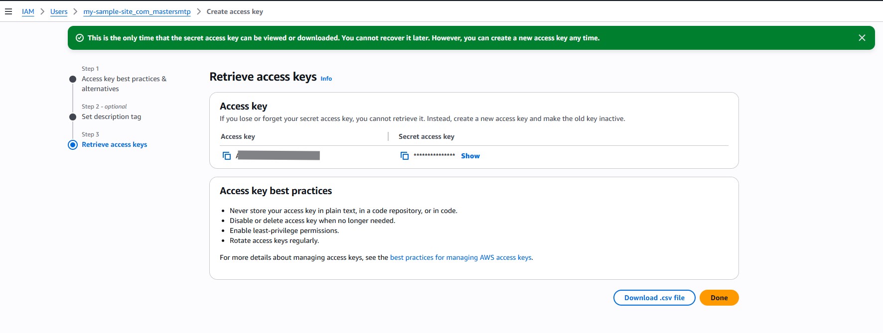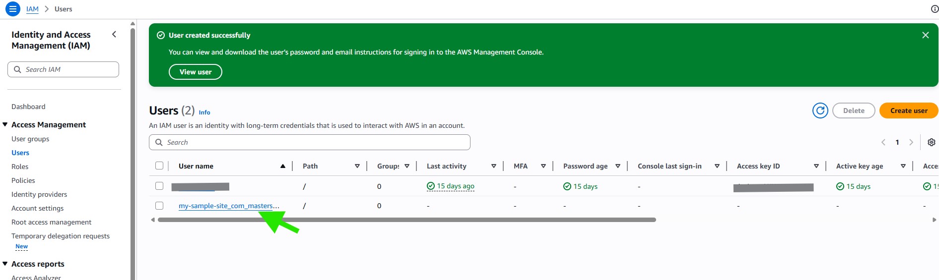 AWS will now display a success message along with the Access key ID and Secret access key for your user. Be sure to securely save a copy of these keys before leaving this page.