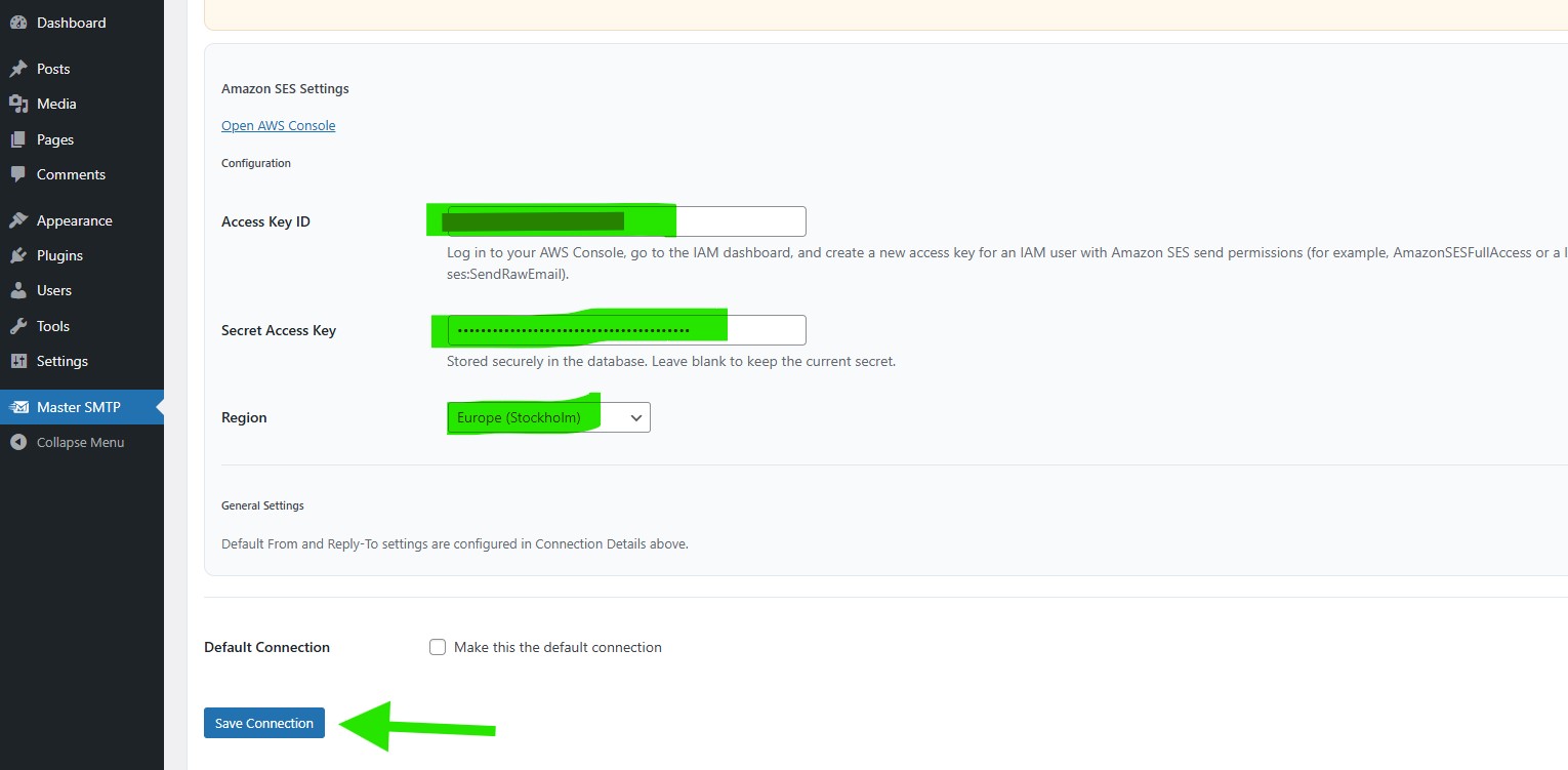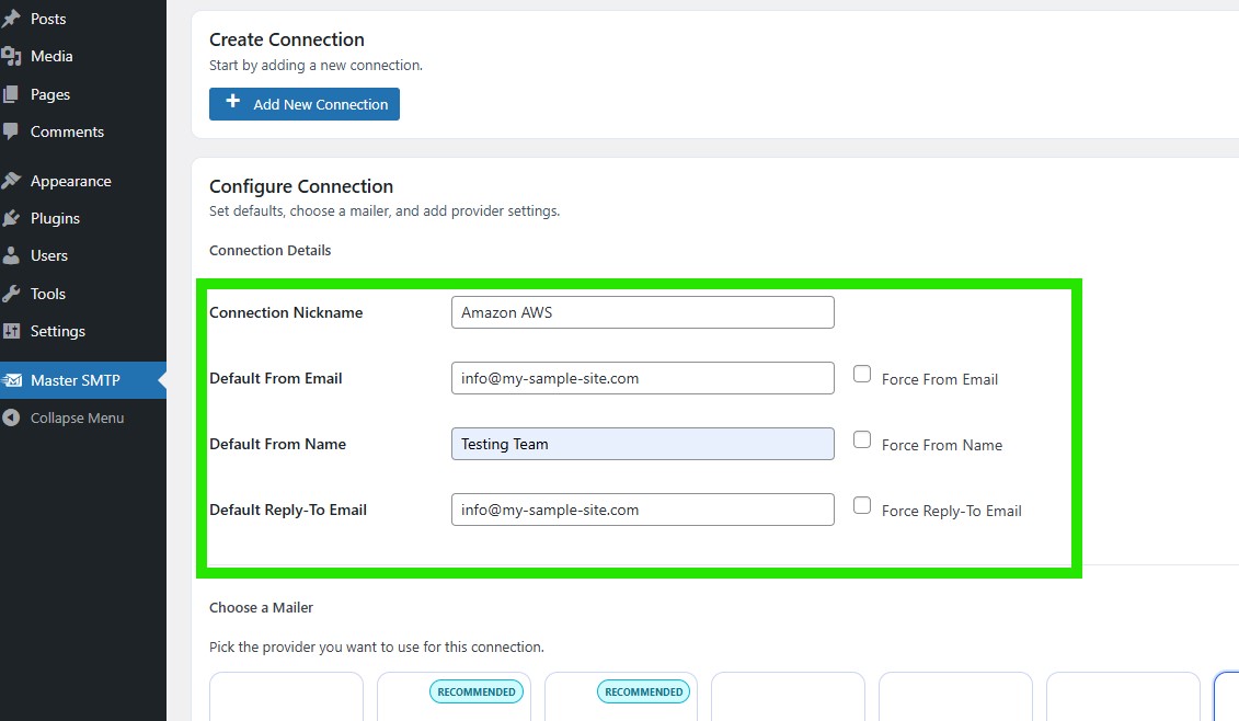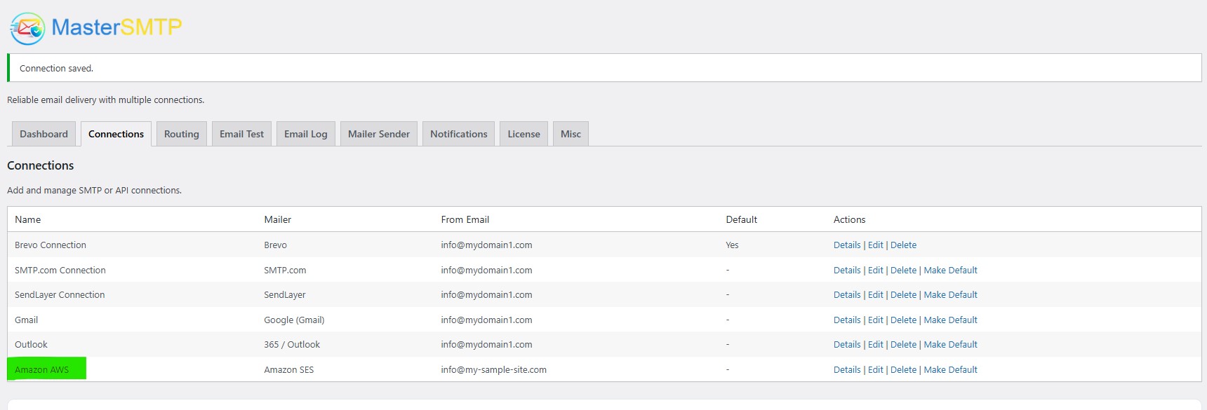 Default Connection: Enable this option if you want this connection to be the default sender for your WordPress website.