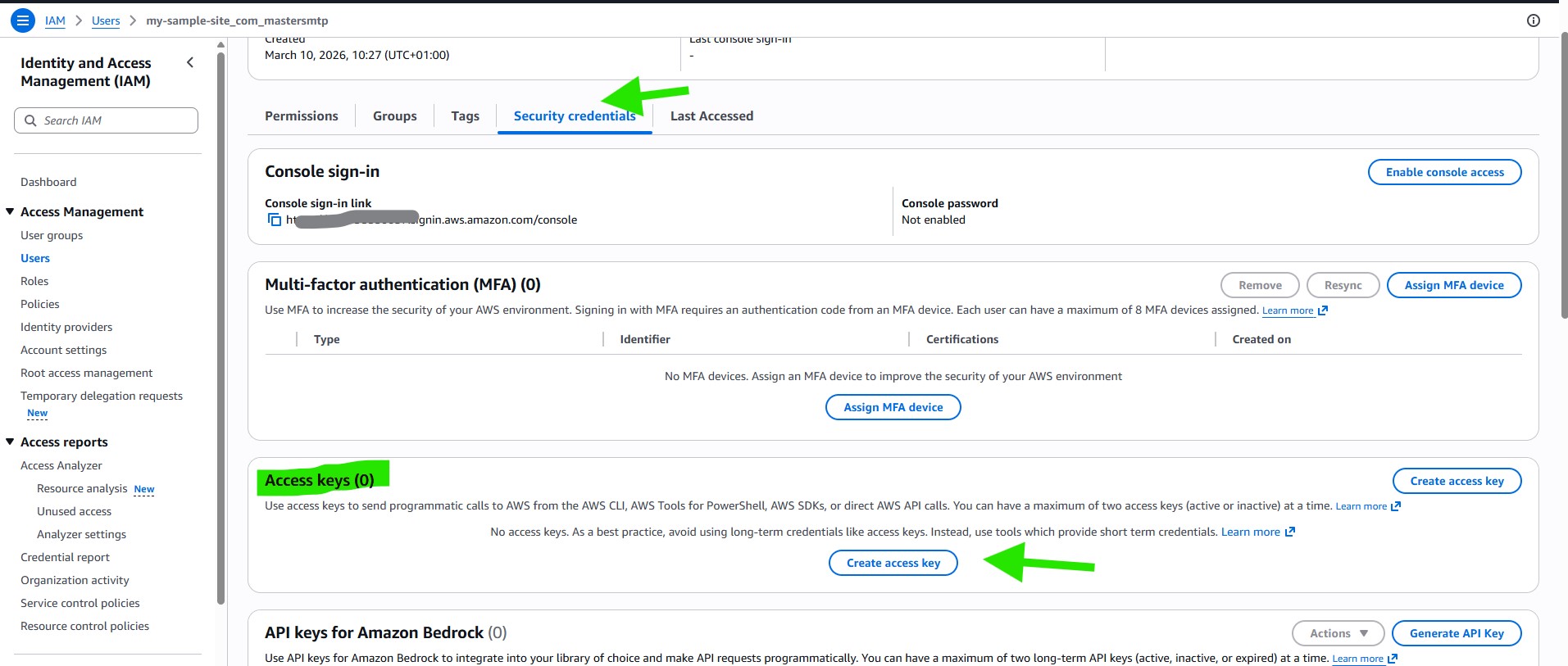 Copy the Access Key ID and Secret Access Key from the Amazon AWS Access keys tab, then paste them into the corresponding fields in the Amazon SES Settings section.