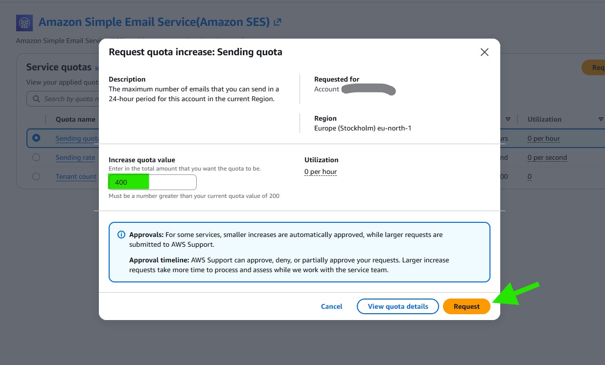 In the Change quota value field, enter your desired daily sending quota. For example, you can request a daily sending quota of 400 emails.