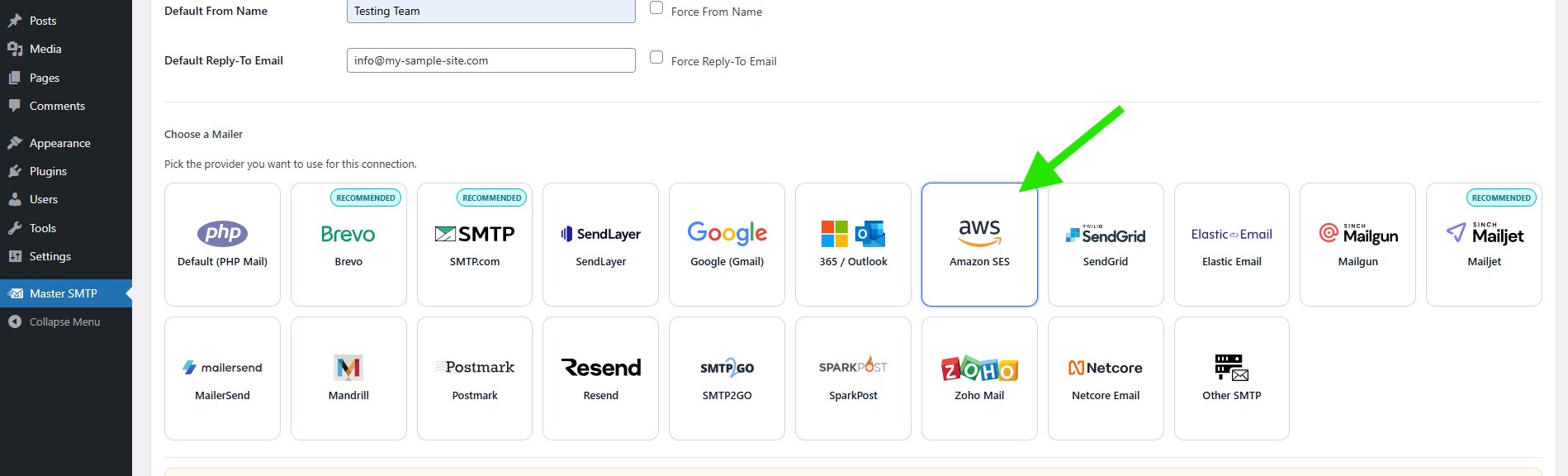 In the Choose a Mailer section, select Amazon SES (AWS) from the grid mailer list.