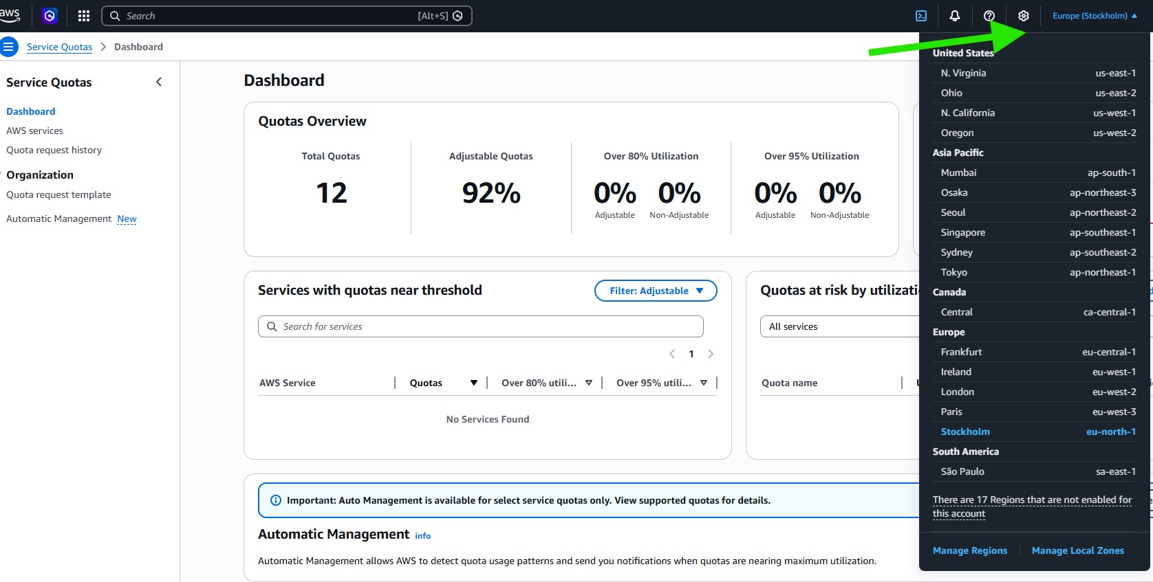 After opening the dashboard, click the Select a Region dropdown and choose your region from the list. Be sure to select the same region you used when setting up your Amazon AWS account.