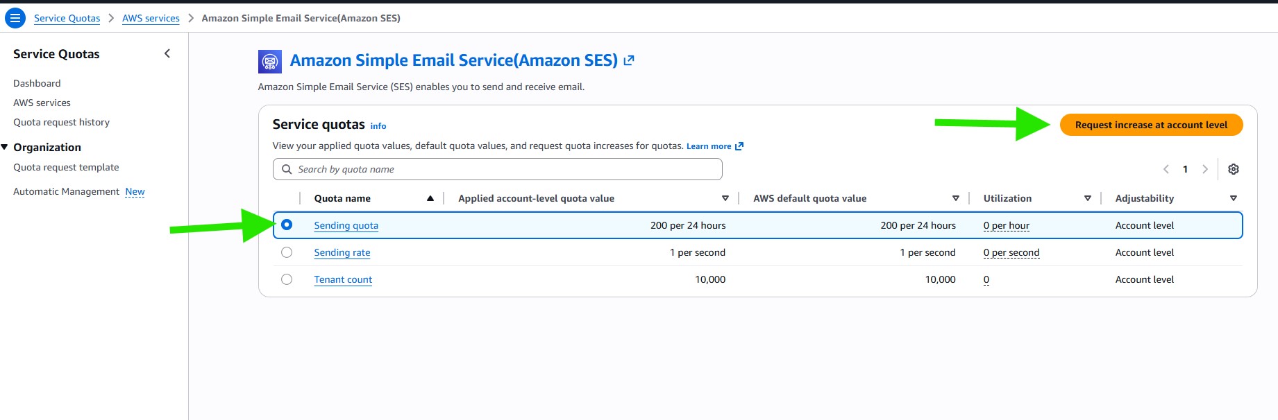 To request an increase to your monthly email sending limit, click AWS services in the sidebar menu.
