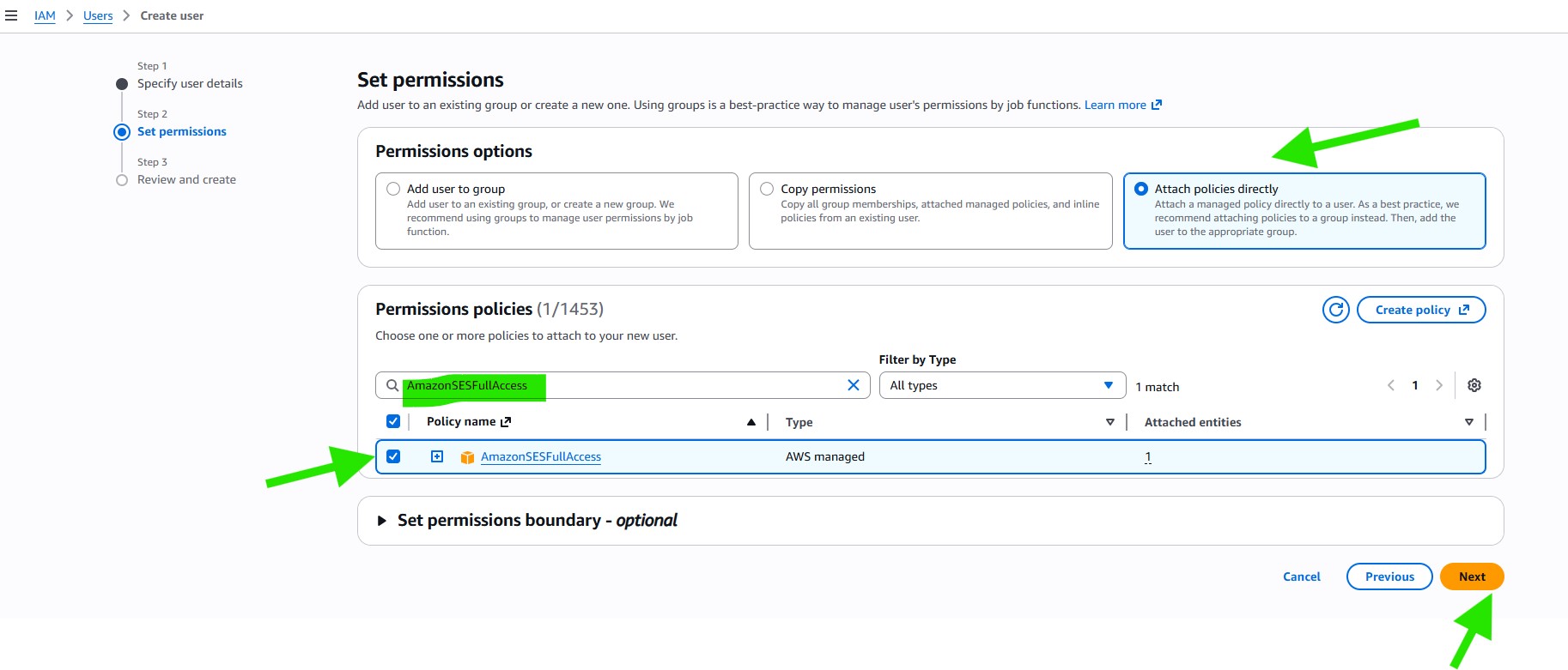 In the search bar, type AmazonSESFullAccess. You should see one result with the same name. Select the checkbox next to this option to grant the user permission to access Amazon SES.
