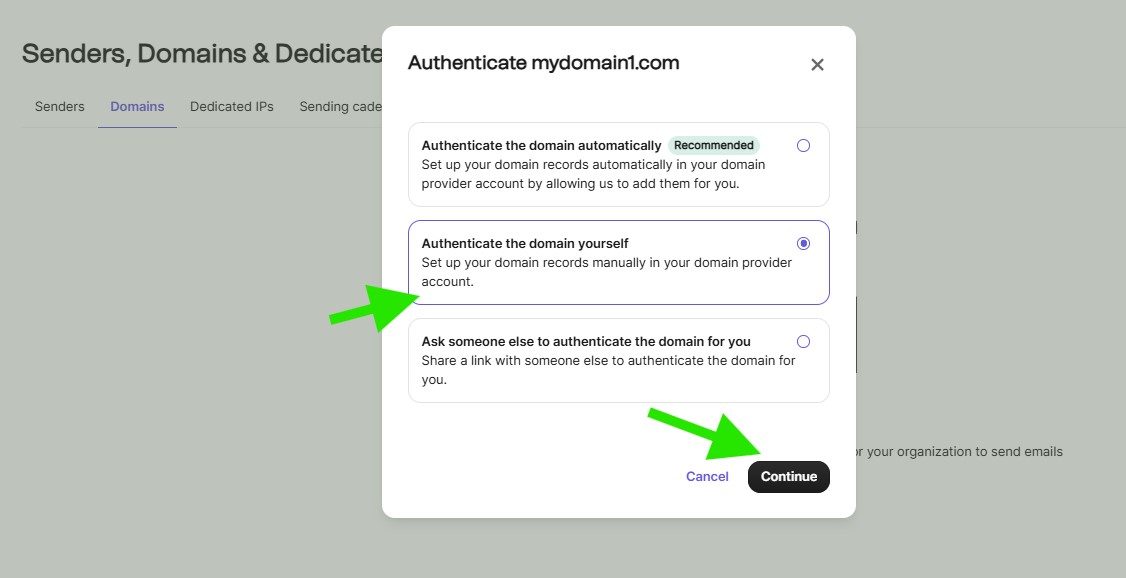 In the Authenticate your domain popup, choose Authenticate the domain yourself, then click Continue.
