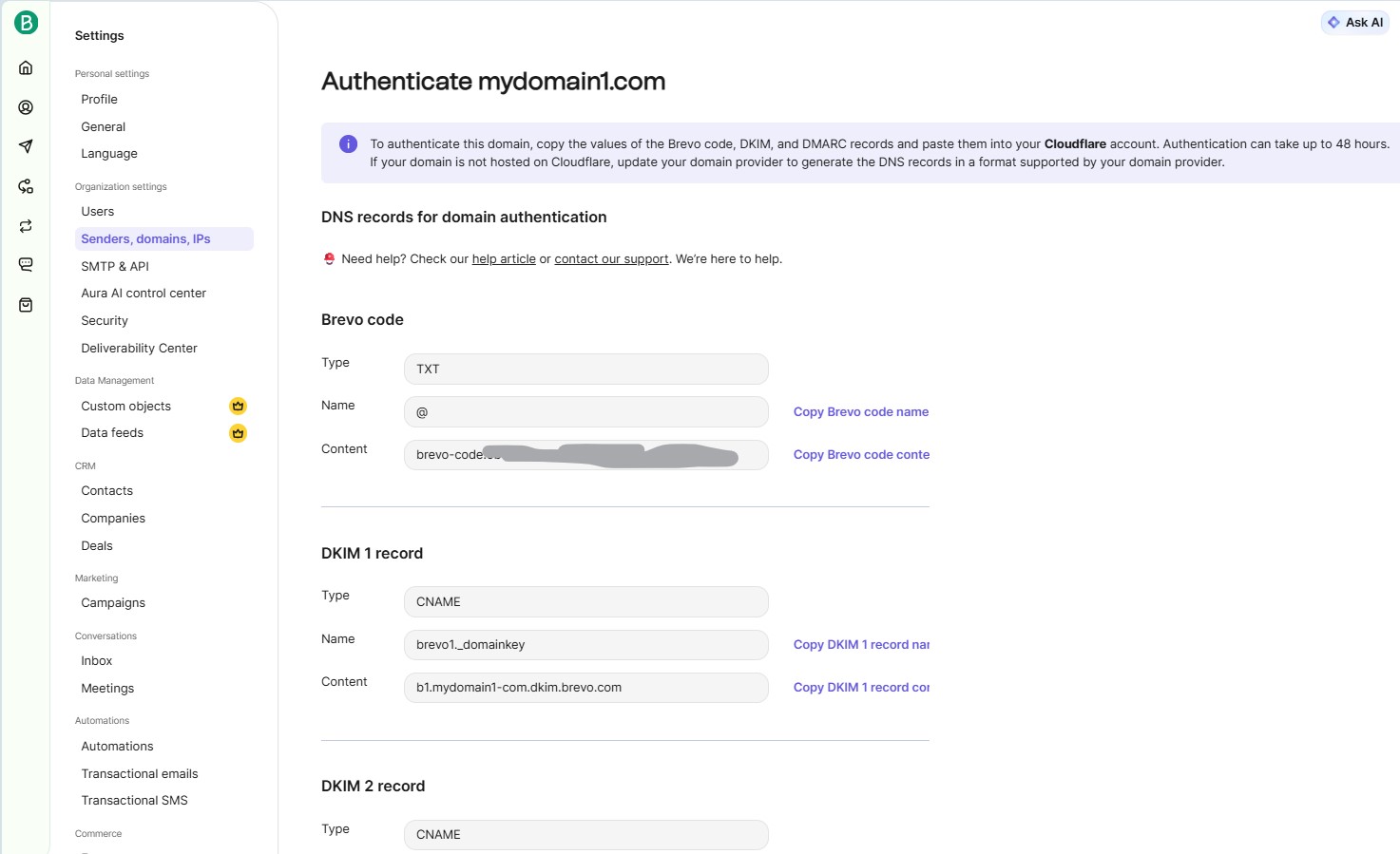 After you add the DNS records, return to Brevo and click Authenticate this email domain.