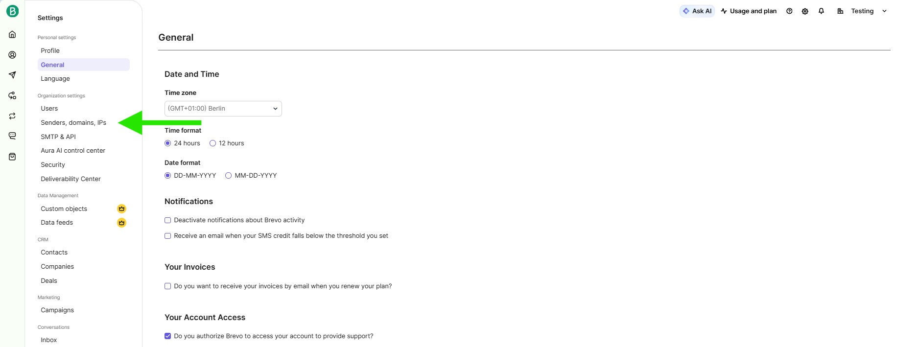 You can also access this page from the Brevo sidebar menu, below Senders, domains, IPs.