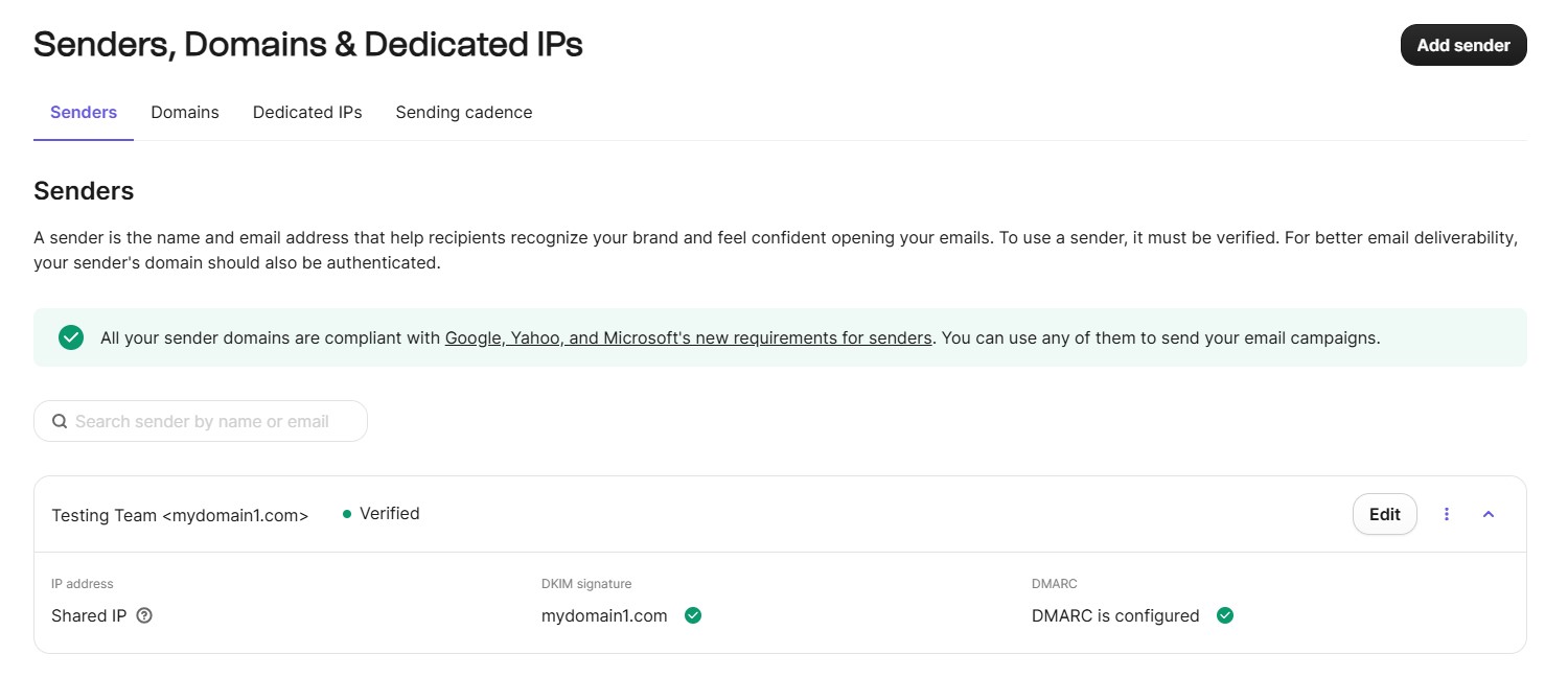 After adding the sender, you should see Verified and DMARC is configured for that email in the Senders list.
