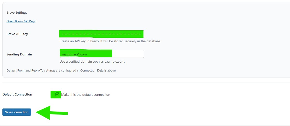Go back to the Brevo connection settings in your WordPress dashboard, then paste the API key you copied.