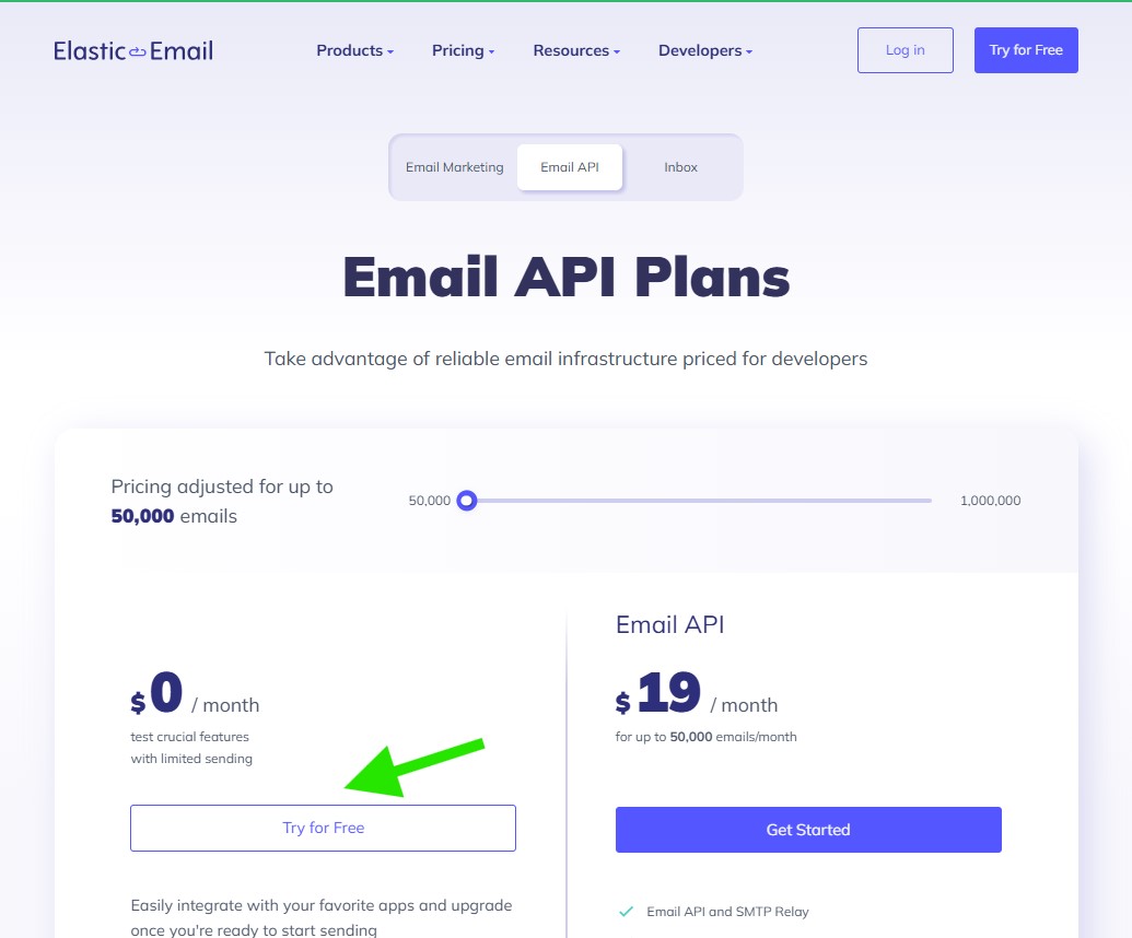 To create your Elastic Email account, open the Elastic Email Email API pricing page and make sure the Email API tab is selected. Then click the Try for Free button to begin the registration process.