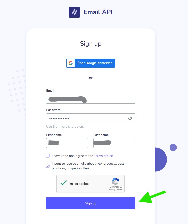 Complete the reCAPTCHA verification, then click the Sign up button to create your account.