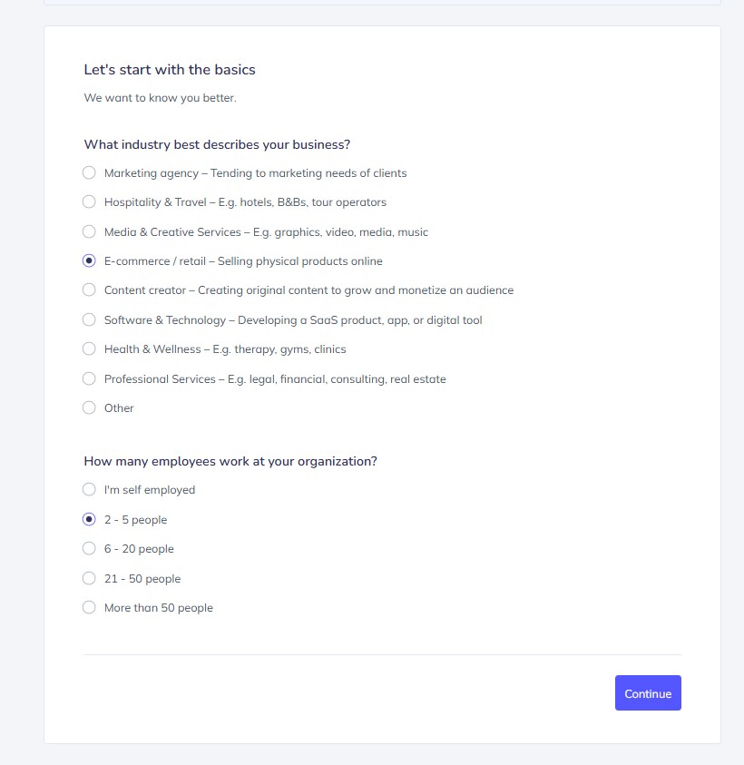 Select the industry that best describes your business, then choose the number of employees in your organization.