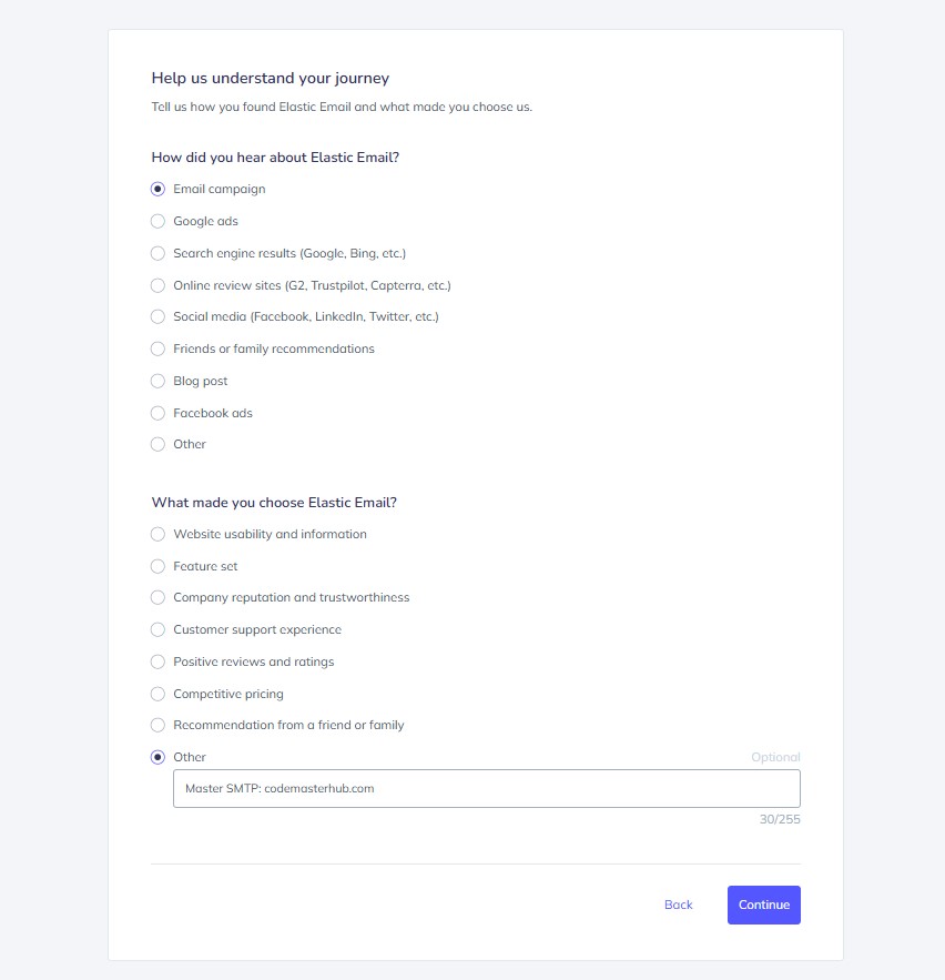 Elastic Email will now ask how you heard about their service and what made you choose it. Select the answers that best match your situation.