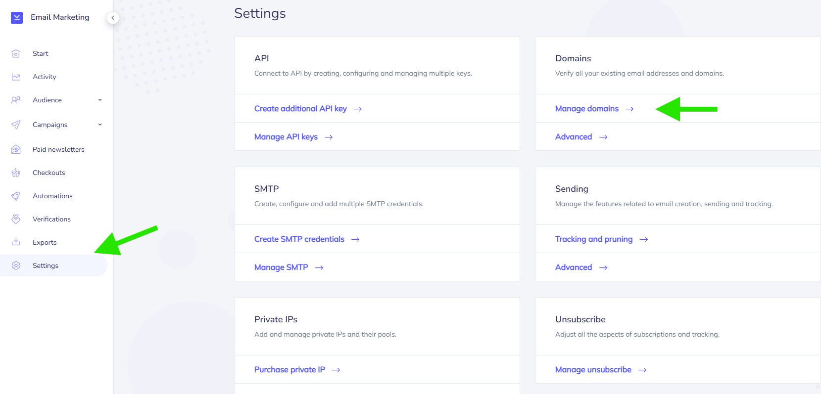 In the Elastic Email dashboard, open the left sidebar and click Settings. In the Domains section, click Manage domains to start the domain setup process.