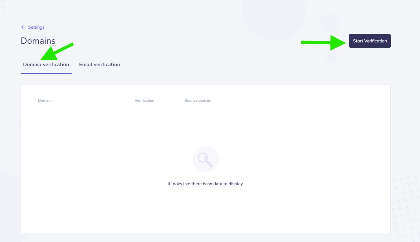 On the Domains page, make sure the Domain verification tab is selected. Then click the Start Verification button in the top right corner. This will begin the process of adding and verifying your domain in Elastic Email.