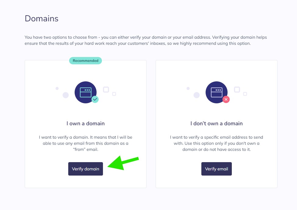 This is the recommended option because it allows you to use email addresses from your domain as the From Email address and helps improve deliverability.