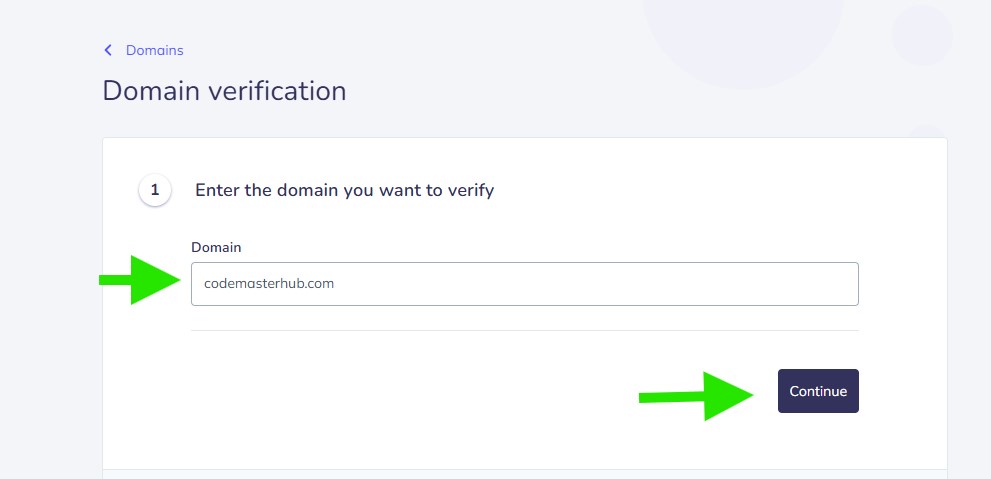 In the Domain field, enter the domain name you want to verify, such as codemasterhub.com.