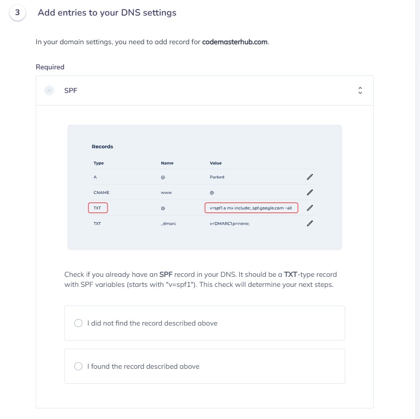 If you do not see an SPF TXT record, select I did not find the record described above. If you already have one, select I found the record described above.