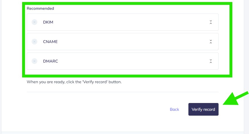 Once you have added all required and recommended DNS records, return to Elastic Email and click Verify record.