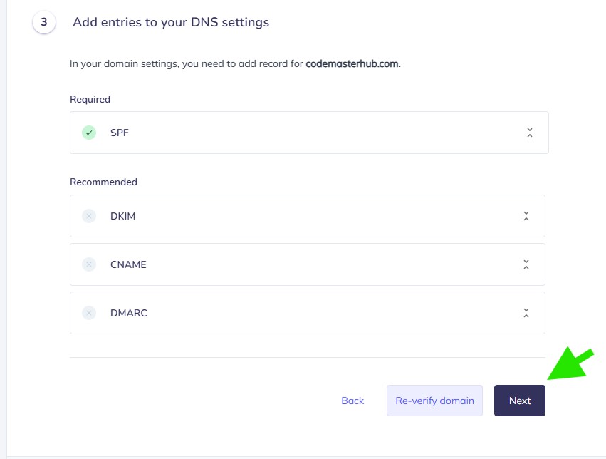 If you have also added the recommended records, you can click Re-verify domain to check them again. Once you are ready to continue, click Next.