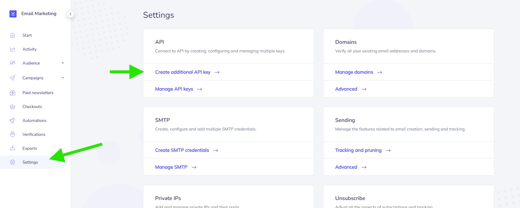 To create an API key in Elastic Email, go to Settings in the left sidebar. In the API section, click Create additional API key.