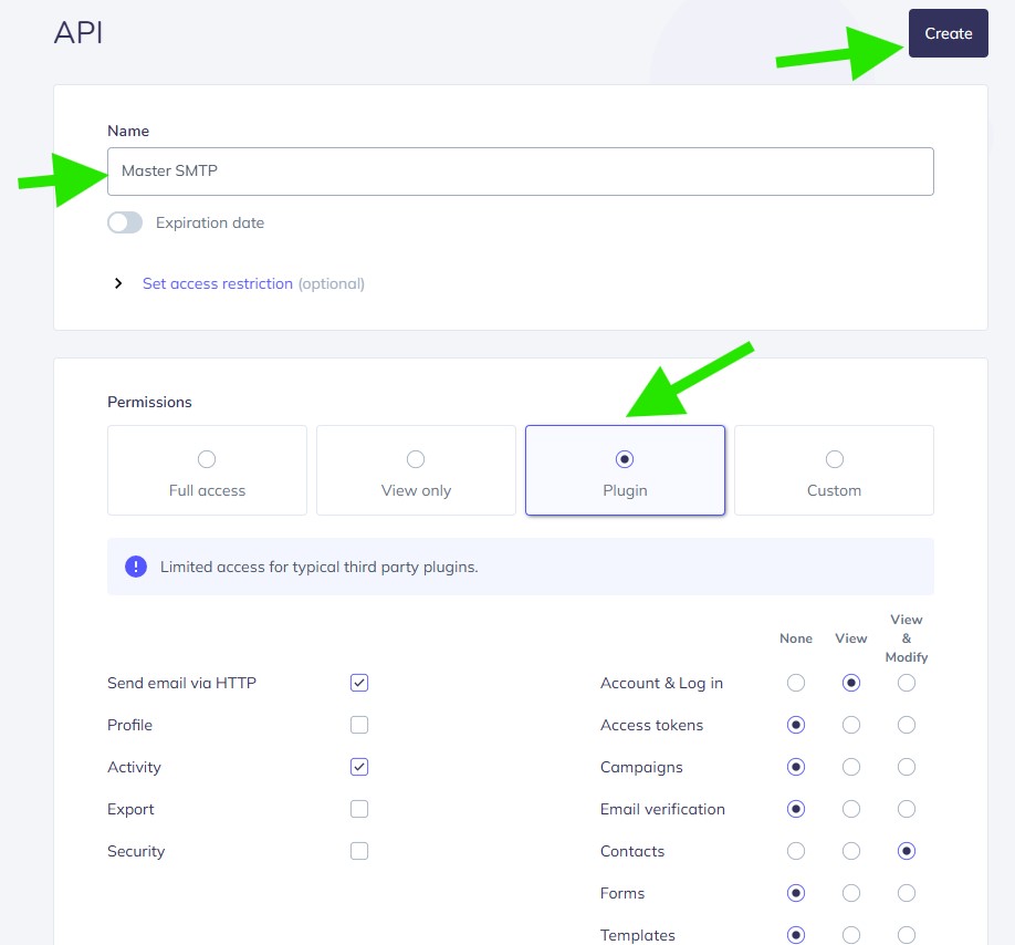 On the API key creation page, enter a name for the key, such as Master SMTP.