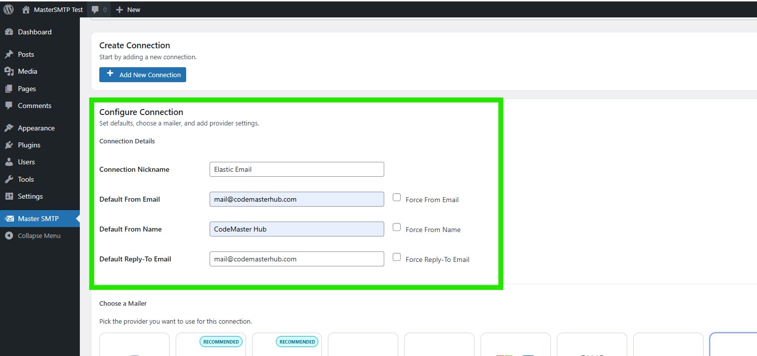 In your WordPress dashboard, go to Master SMTP > Connections, then click Create New Connection.