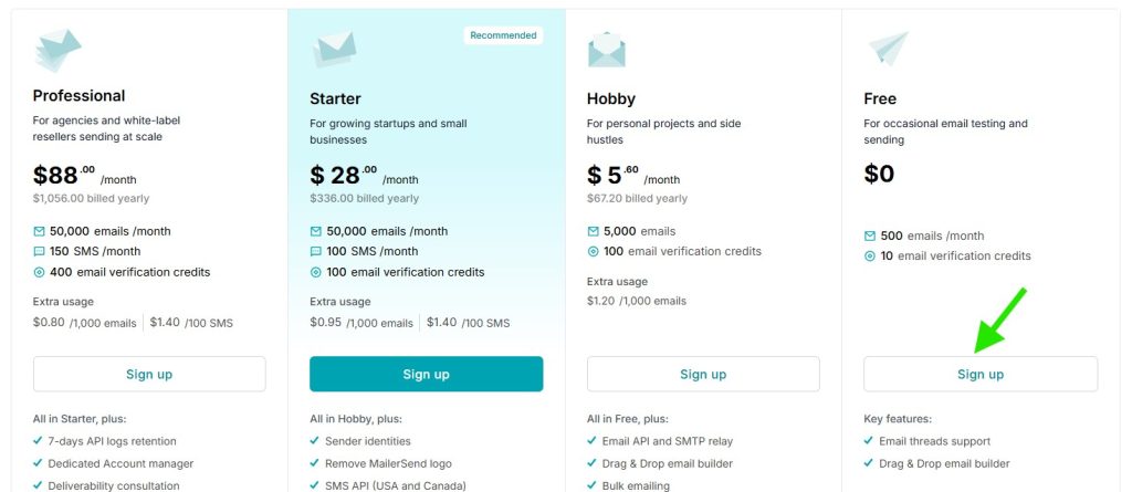 To start, you need to create a MailerSend account if you do not have one already. Visit the MailerSend pricing page and choose the plan that best fits your needs.