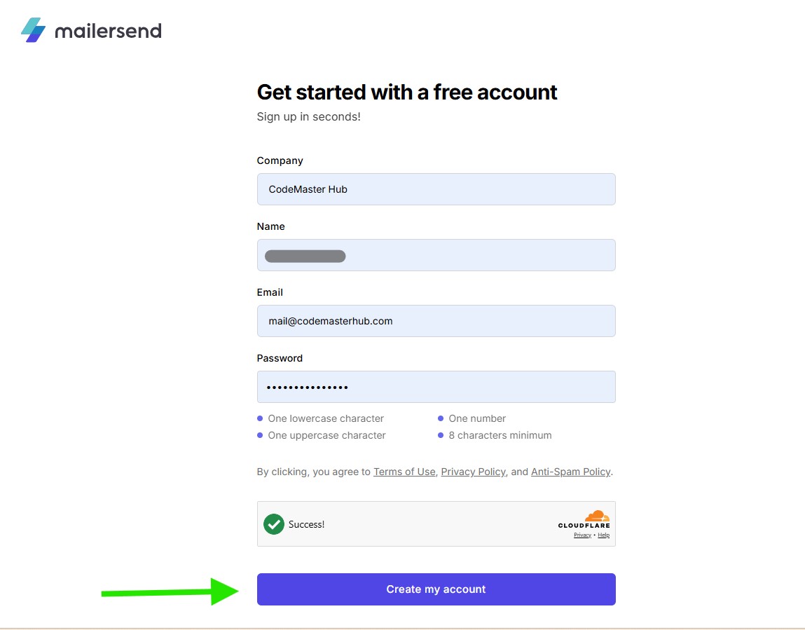 Fill in the signup form with your details, complete the verification step if required, then click Create my account to continue.