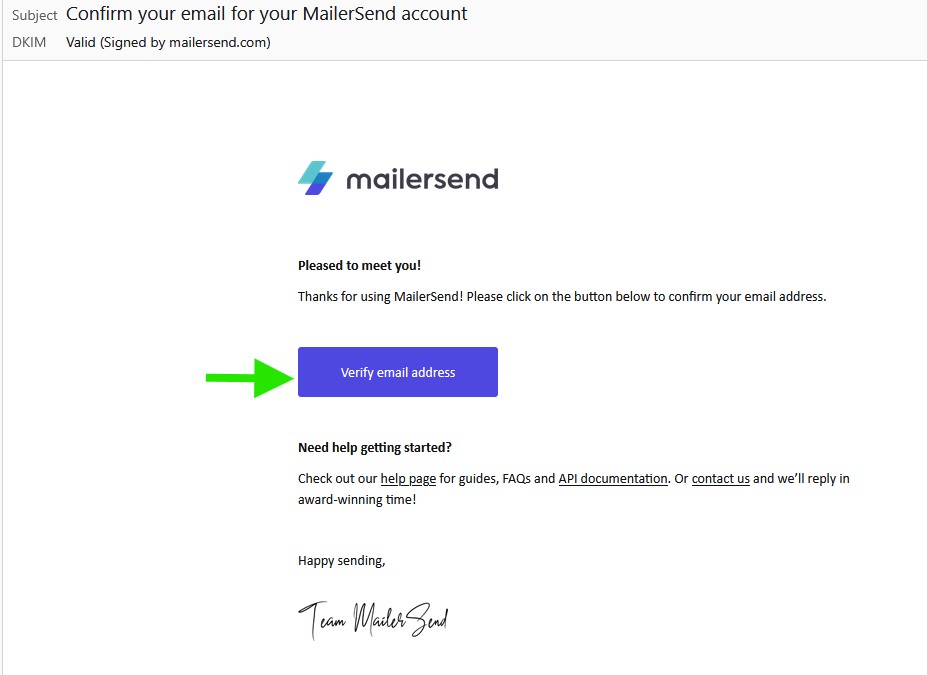 MailerSend will send a confirmation email to the address you used during signup. Open the email, then click Verify email address to confirm your email and activate your account.