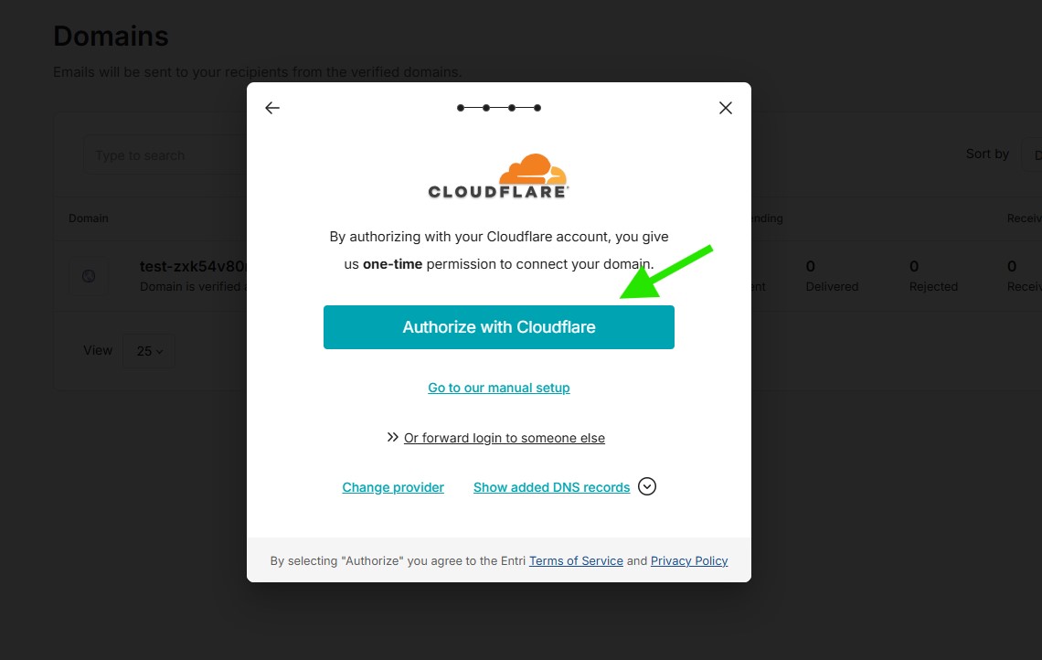 If your DNS provider is supported, you can click Authorize with Cloudflare and let MailerSend add the DNS records automatically. If you prefer to add the records manually, click Show added DNS records, then copy and add those DNS records in your domain DNS settings.