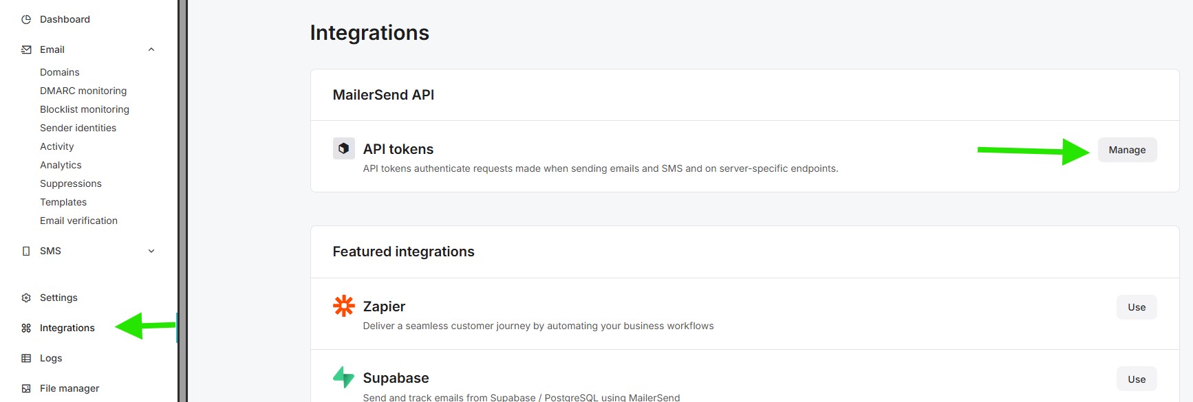 To get your MailerSend API key, go to https://app.mailersend.com/api-tokens. You can also access it from your MailerSend dashboard by going to Integrations, then under MailerSend API, click Manage.