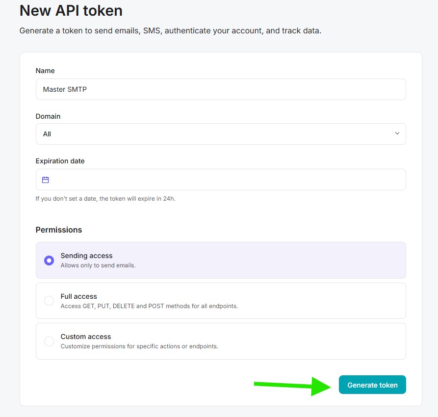 Enter a name for the token, choose the domain you want to use, and select the appropriate permissions. In most cases, Sending access is enough for Master SMTP. Then click Generate token.