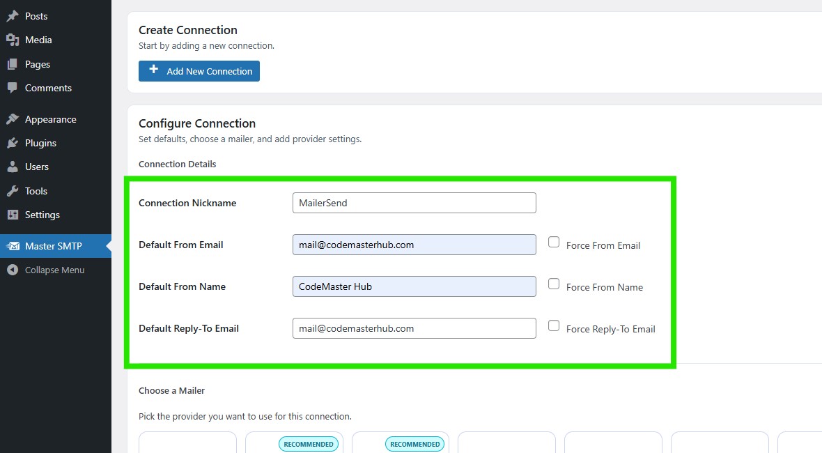 In your WordPress dashboard, go to Master SMTP > Connections, then click Create New Connection.
