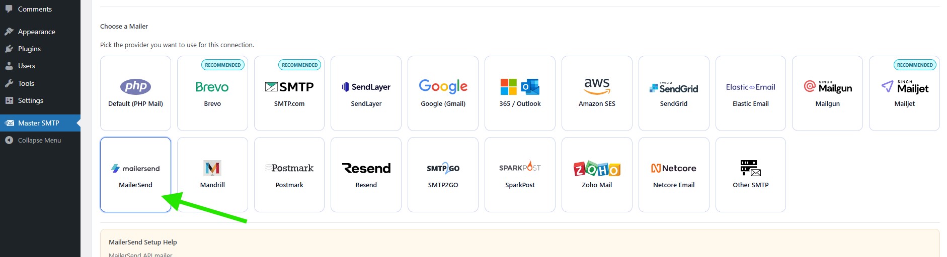 In the Choose a Mailer section, select MailerSend from the grid mailer list.