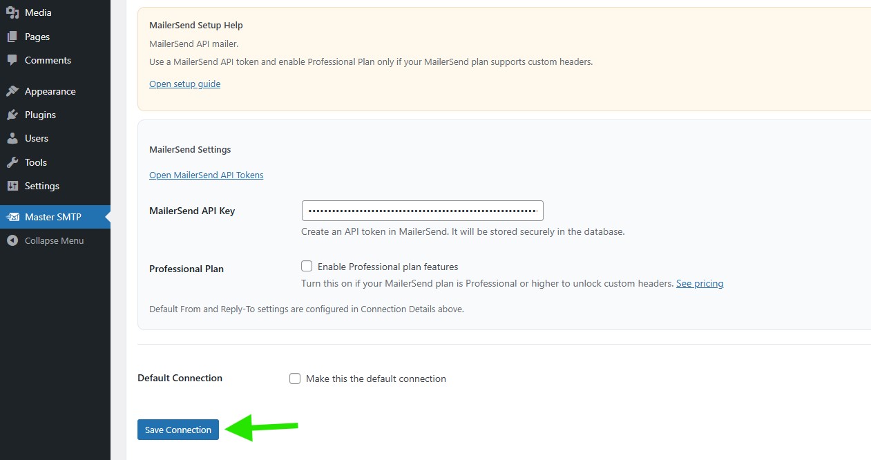 Enter your MailerSend API Key in the matching field. Enable Professional Plan only if your MailerSend account is on a paid plan that supports those features, not on the free plan. If you want to use this connection as the main mailer for your website, check Make this the default connection. Then click Save Connection.