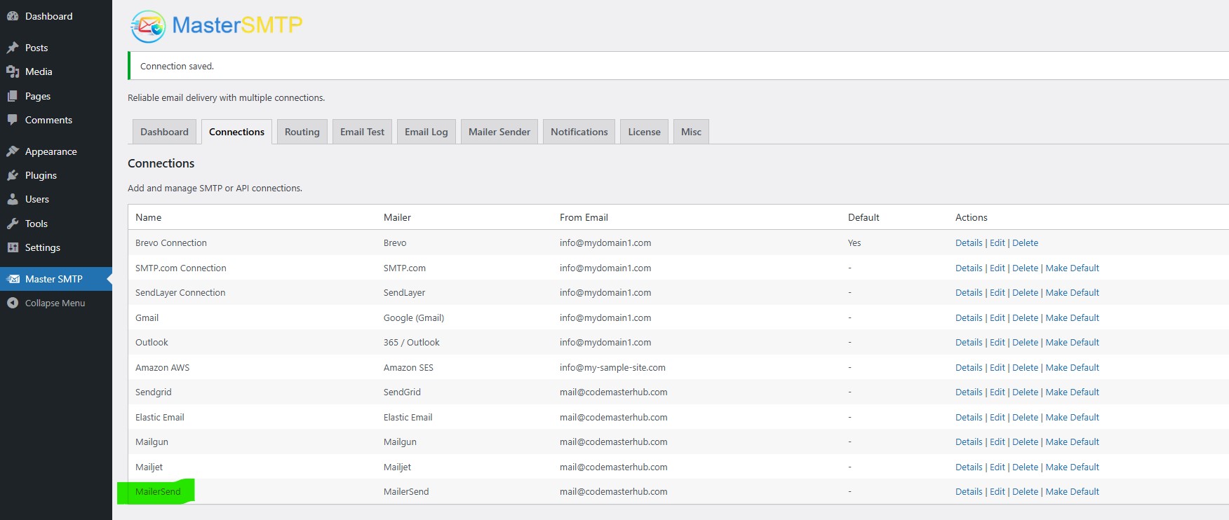MailerSend is a cloud based email delivery service designed for sending transactional emails reliably and securely. It provides SMTP and API options, along with tools for domain verification, sender management, analytics, and email delivery monitoring. In Master SMTP, MailerSend can be used as your mailer to help send WordPress emails more consistently and with better deliverability.