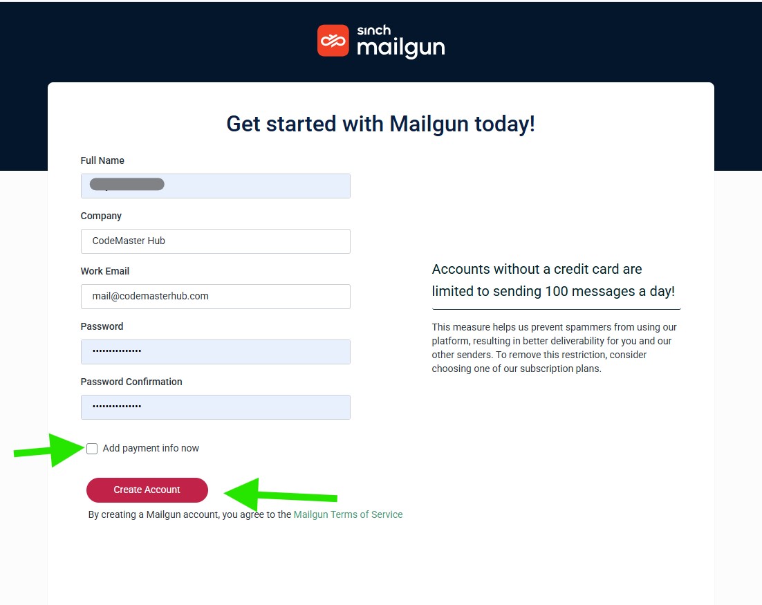 Note: Uncheck Add payment info now if you want to start with the free plan that allows up to 100 messages per day.