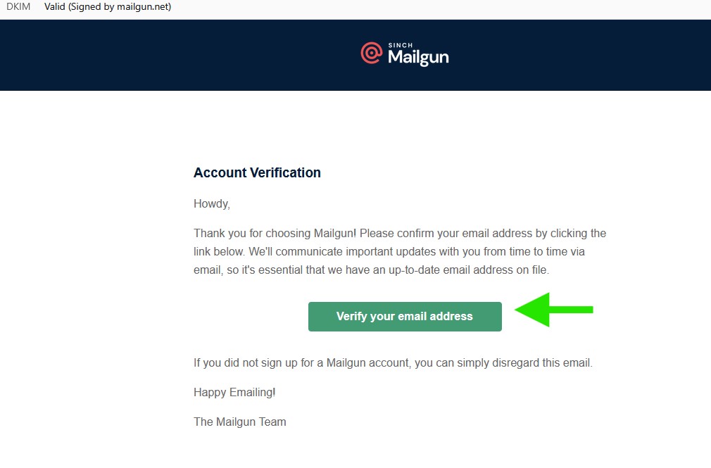 After creating your Mailgun account, Mailgun will send a verification email to the address you used during signup.