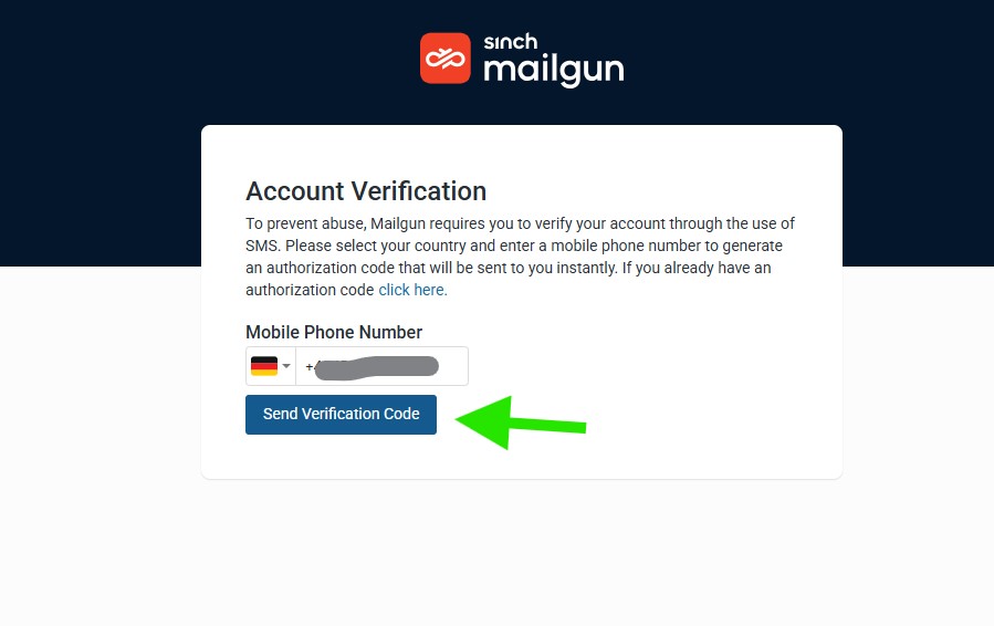 Note: Mailgun requires phone verification to help prevent abuse and secure new accounts.