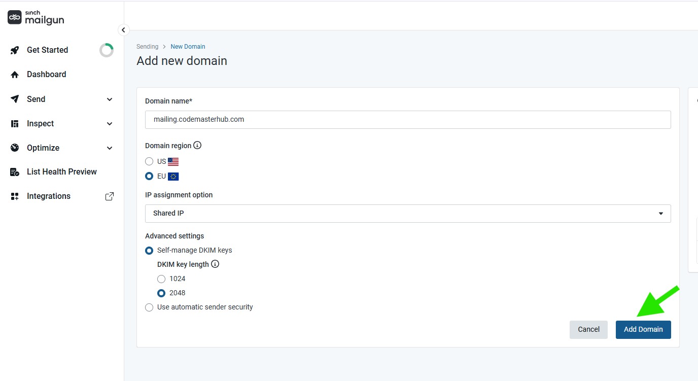 This will open the domain setup screen, where you can add and configure your domain for sending emails.