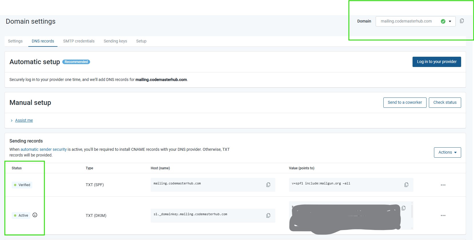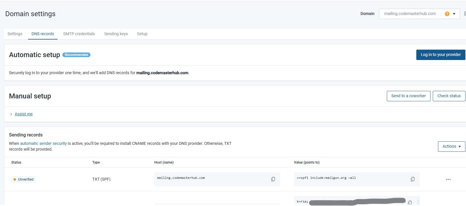 - Manual setup: Copy the required DNS records from Mailgun and add them manually in your domain DNS zone.
