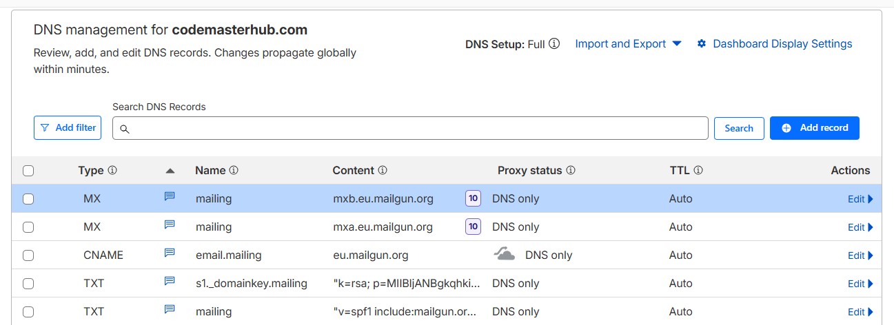 The screenshot below shows the Mailgun DNS records added manually in Cloudflare. Make sure the CNAME record is set to DNS only and is not proxied.