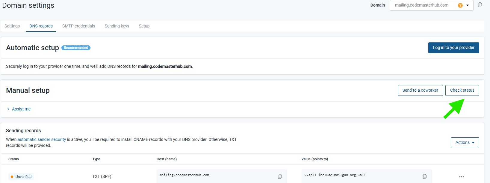 After adding the DNS records to your domain, return to the Mailgun Domain settings page and click the Check status button.