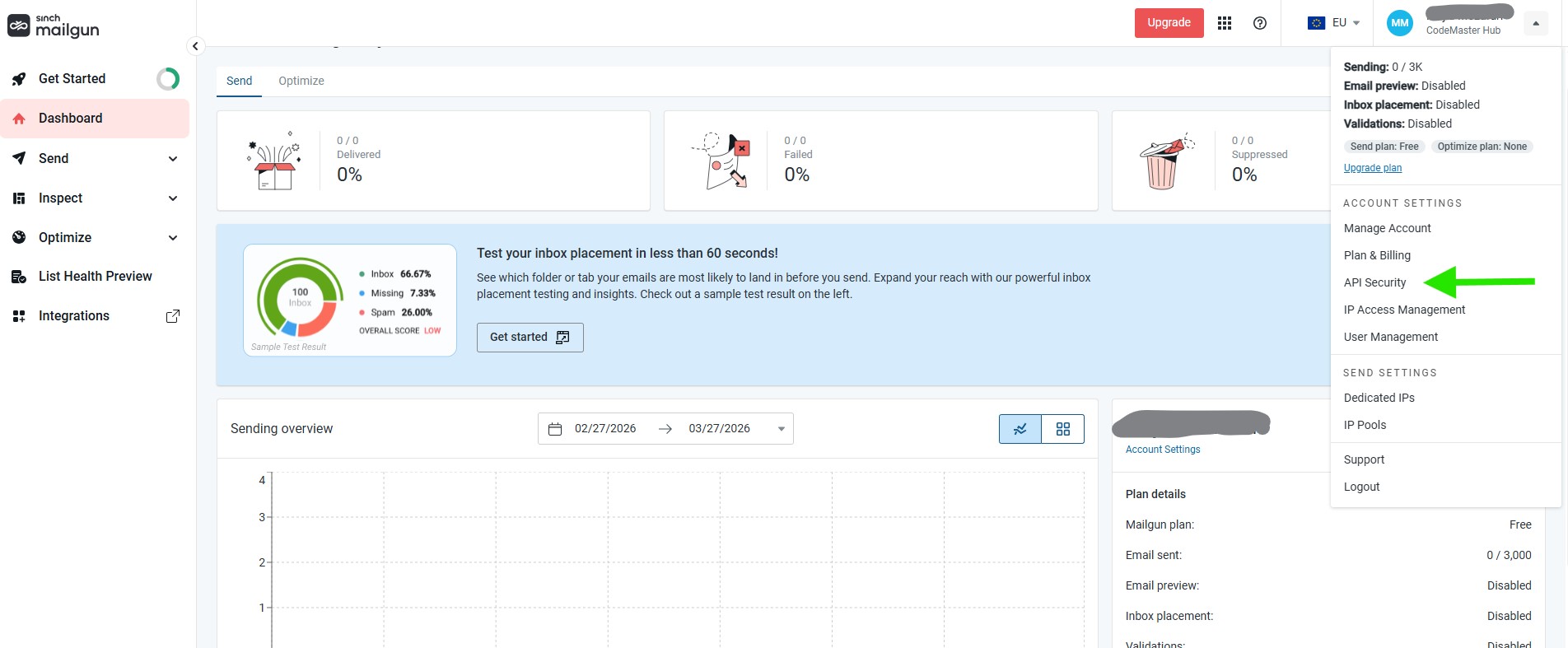 To create a Mailgun API key, click the arrow next to your profile name in the top right corner to open the account menu, then click API Security.