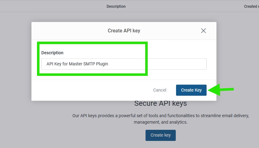 In the popup, enter a description for the API key, for example API Key for Master SMTP Plugin, then click Create Key.