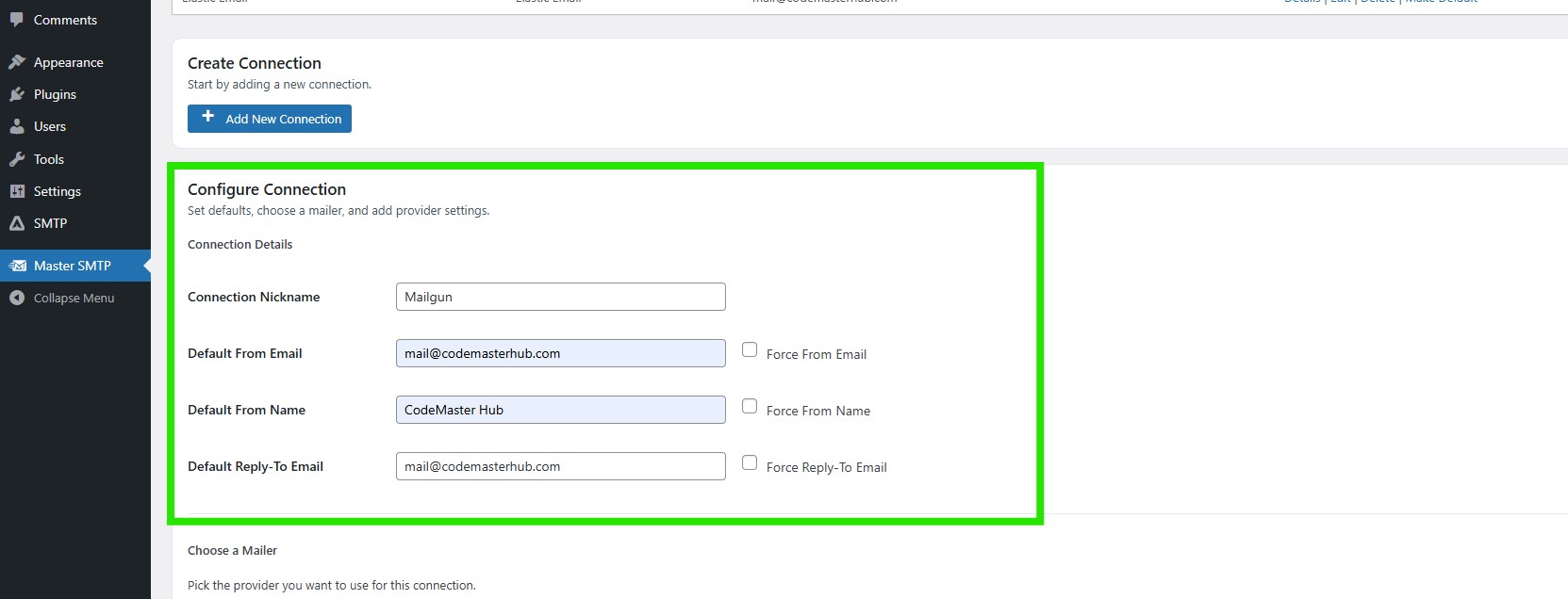 In your WordPress dashboard, go to Master SMTP > Connections, then click Create New Connection.