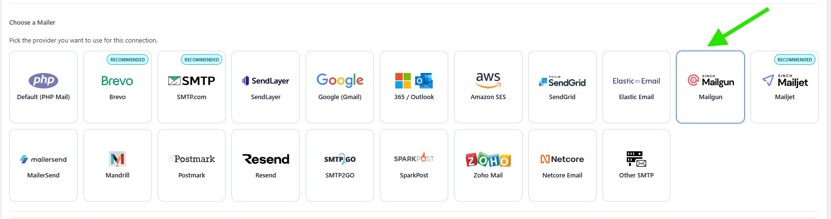 In the Choose a Mailer section, select Mailgun from the grid mailer list.