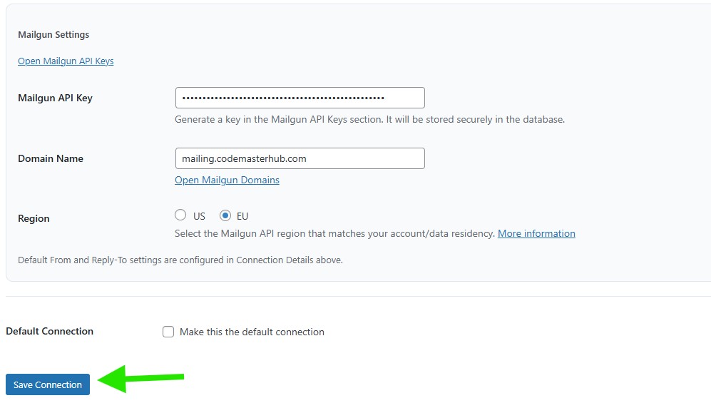 - Mailgun API Key: Paste the API key you copied from your Mailgun account.