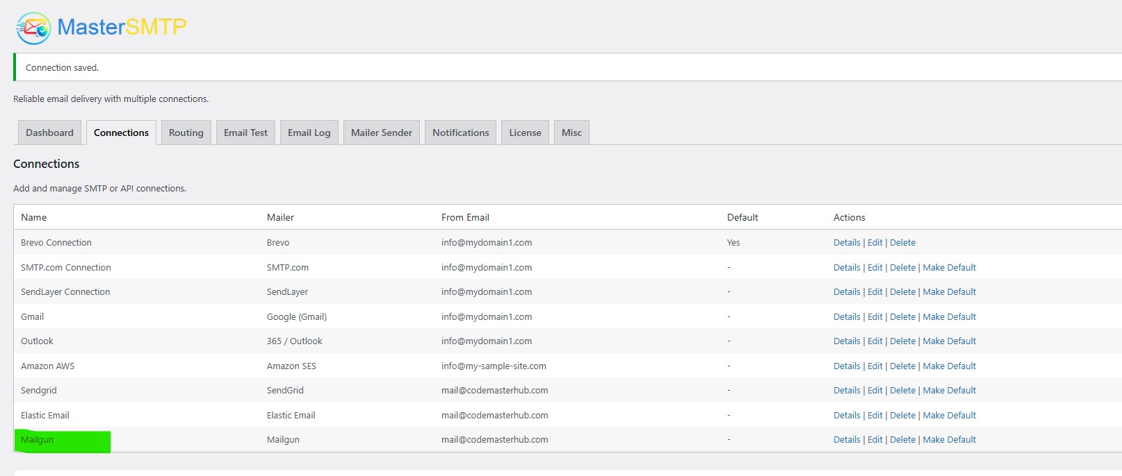 If you want to use this connection as your main mailer, enable Make this the default connection under Default Connection.